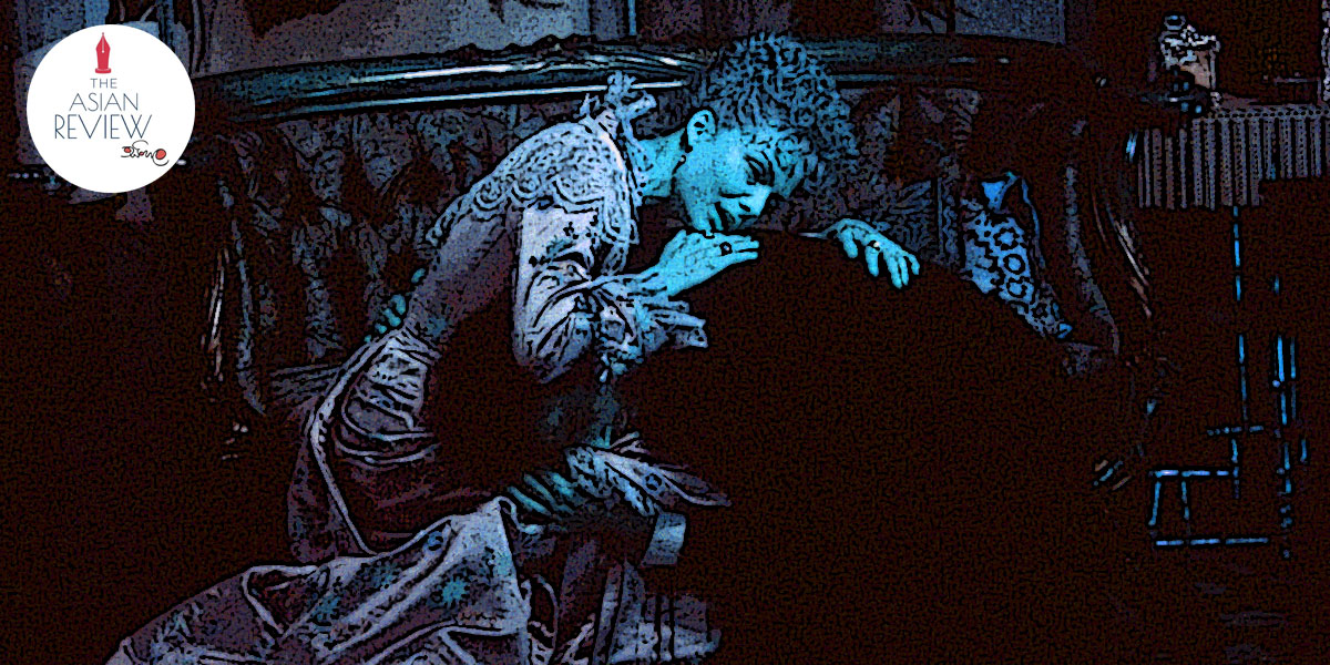 “මේ මනස්කාන්ත උද්‍යාන මධ්‍යයේ නීල්සන් මැතිනිය ළා නිල් සැටින් රෙද්දෙන් කළ දිග ඉරි සහික සුදු කැෂ්මියර් ඇඳුමකින් සැරසී, නිල් බඳපටියෙන් එල්ලා වැටුණු ජාලාකාර පලඳනාවකින් යුතුව මස්ලින් හැට්ටය දෙපස රැඳි ගේට්ටු කහ පැහැති වරලස සහිතව, දෑස් පහතට හෙළාගෙන කැපෝල් මහතාගේ රාගාන්වික පෙම් බස්වලට සවන් දෙමින් සිටියාය” (කවරයේ කතාව).